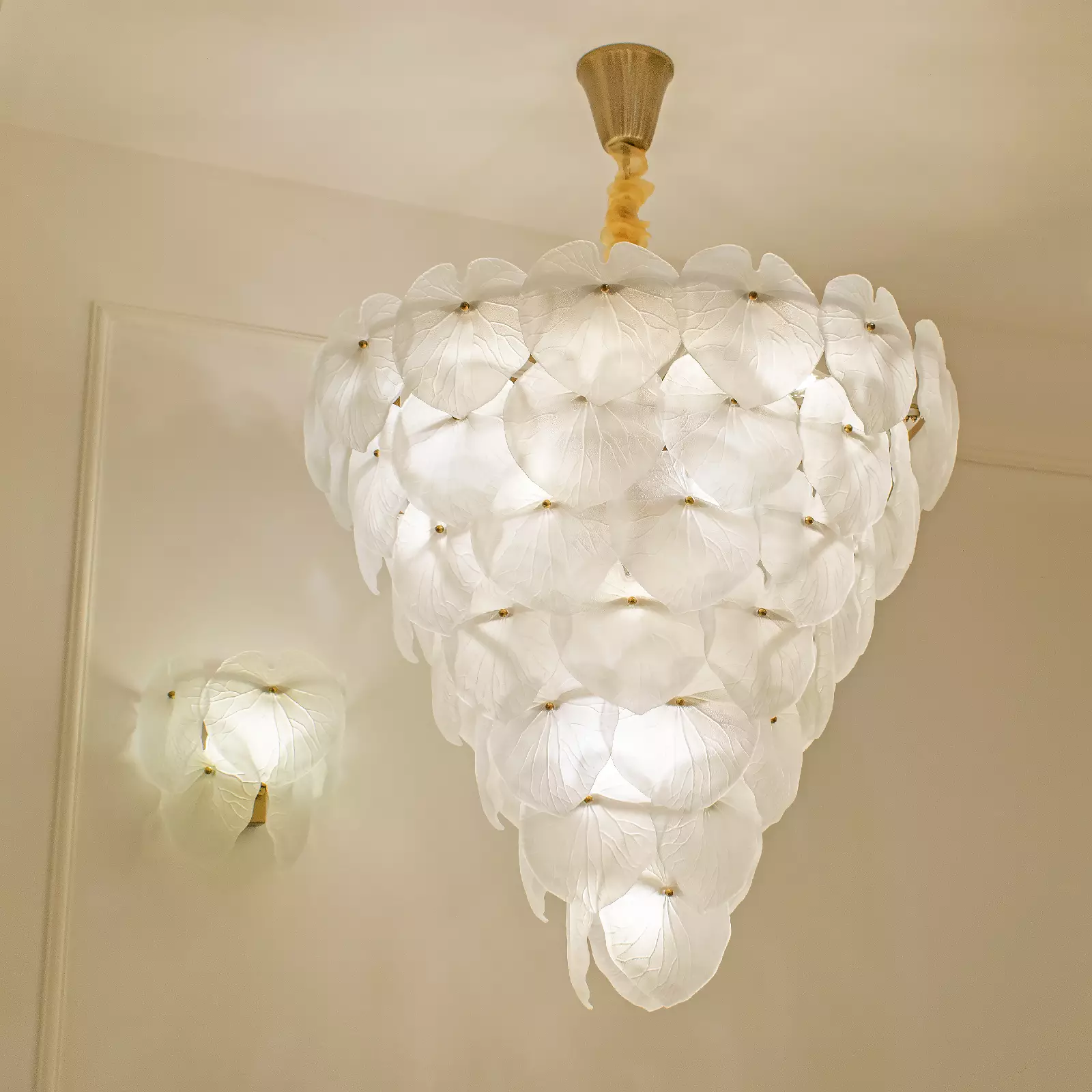 لوستر کریستالی طبقاتی برگ لوتوس 80 نیرا، از کریستال های برگ لوتوس (نیلوفر آبی) بهره می برند. گیاه لوتوس یا نیلوفر آبی، یک گیاه شناخته شده است که نماد خلوص، روشن ضمیری روح، و تولد دوباره است. در این لوستر اما از فرم زیبای برگ این گیاه استفاده شده است.