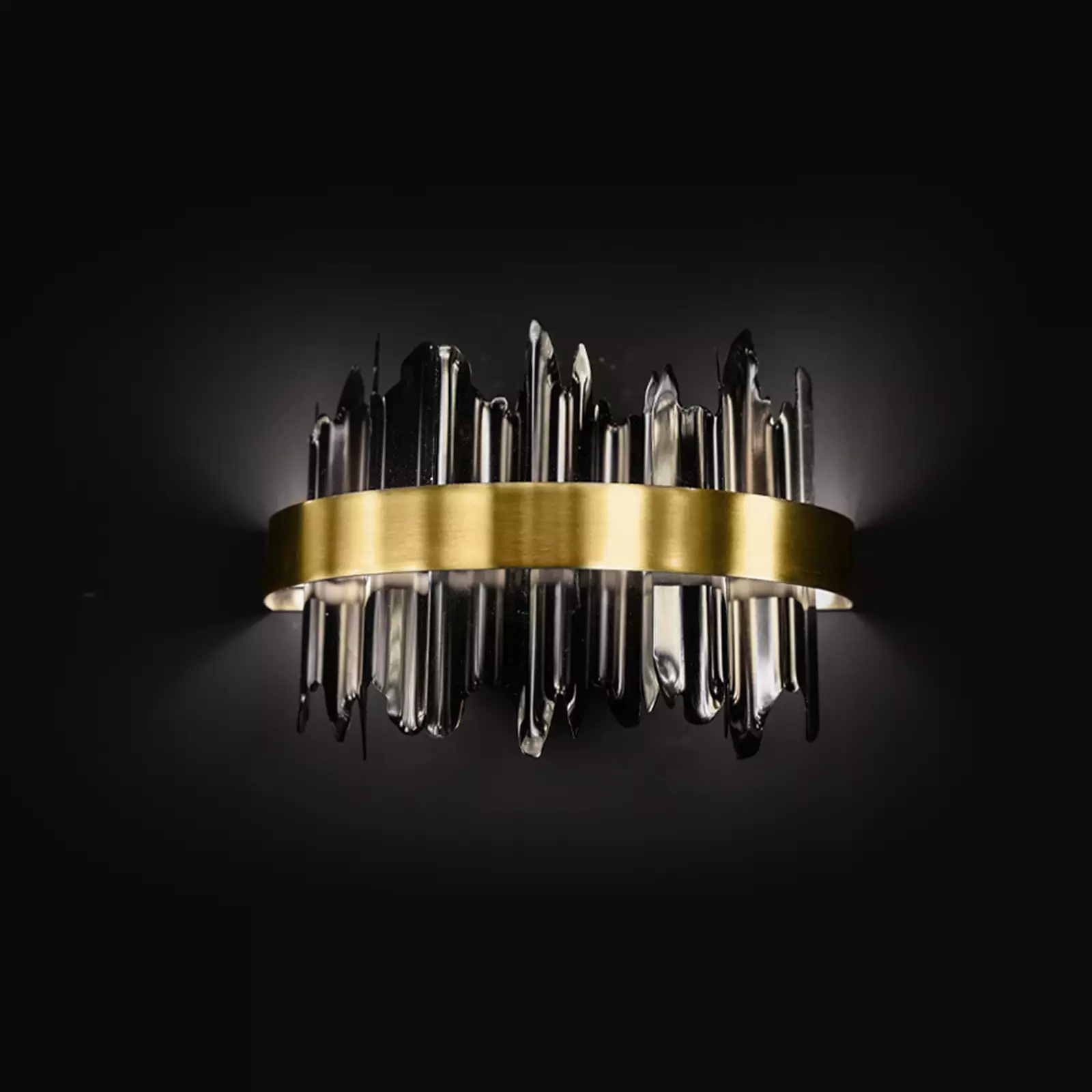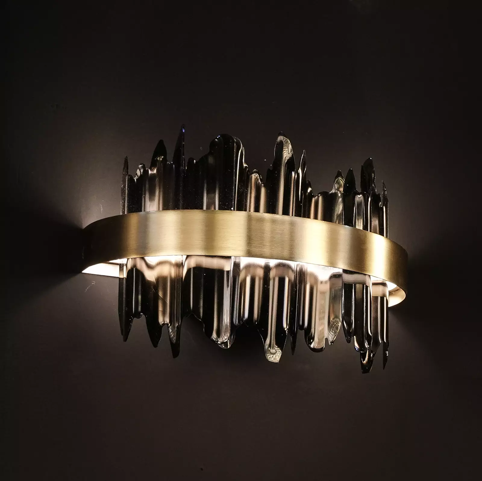 یک رینگ نیمه دایره ای دقیق و صاف از دیوار بیرون می آید. این رینگ پیشانی چراغ دیواری فلزی را تشکیل می دهد، که در بردارنده ی قسمت دکوراتیو است. بخش دکوراتیو داخلی، به شکل امواجی فلزی است که به صورت نامنظم درون آن جا خوش کرده اند.