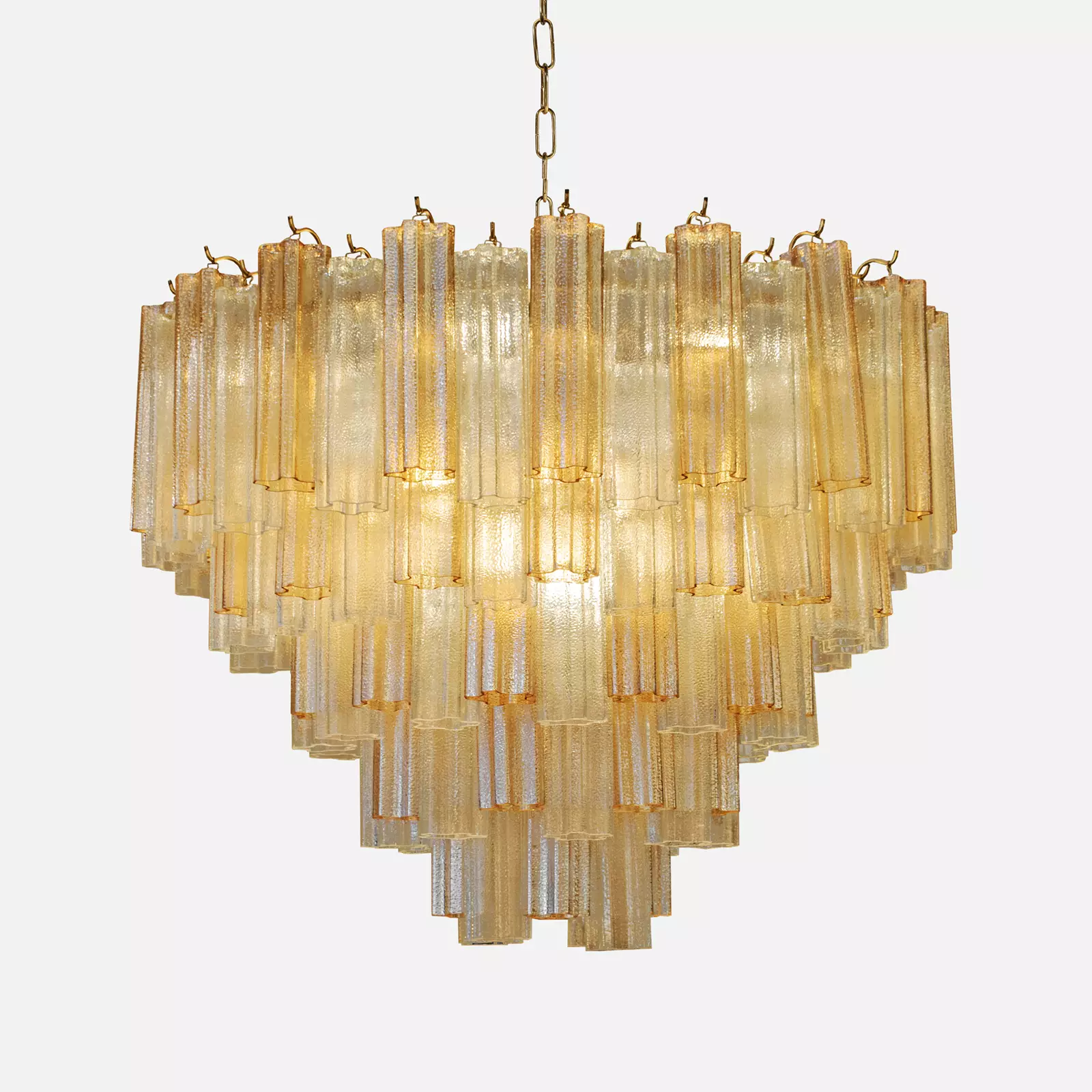 کریستال ها به چهار رنگ شفاف/شامپاینی/دودی/مات هستند که چینش آن ها می تواند به صورت تک رنگ و یا ترکیبی از دو یا بیشتر تعداد رنگ باشد. این لوستر 5 طبقه کریستال دارد که هر طبقه روی طبقه ی زیرین قرار می گیرد و در نهایت به یک فرم مخروط یک جهته می رسد.